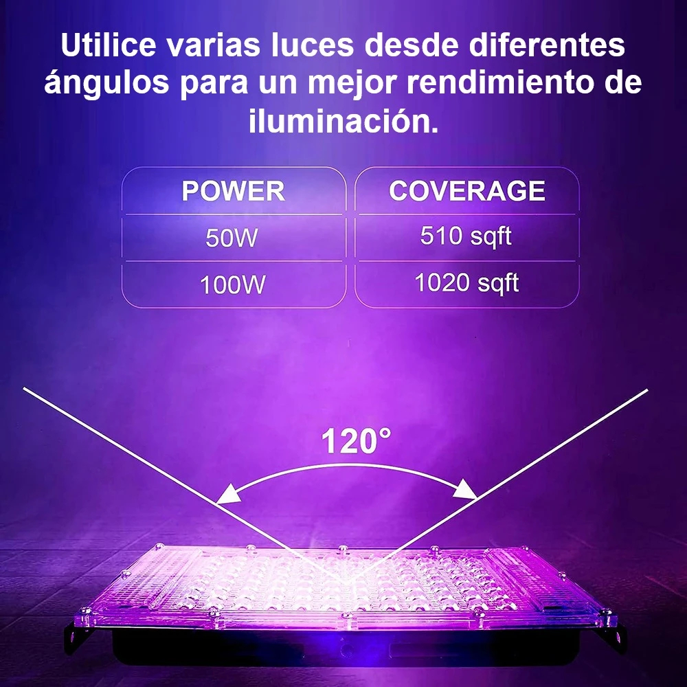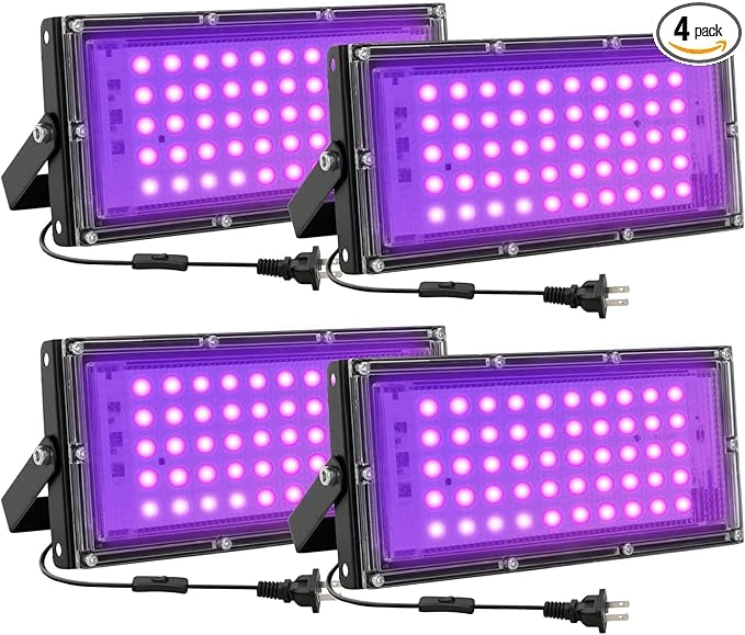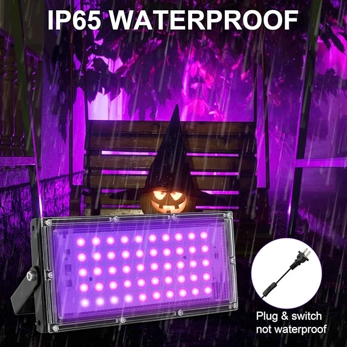 POTENTES LUCES NEGRAS DE 50 W. Cada luz negra resistente al agua para interiores cuenta con chips LED de alta potencia que garantizan una salida de luz de alto brillo. Su lente resistente al calor y a los impactos con alta transmitancia de luz produce una luz negra más pura que otras luces negras.